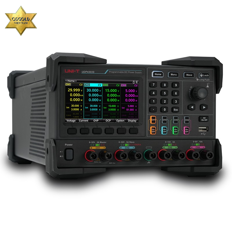 Nguồn DC tuyến tính có thể lập trình UDP4303S có hai đầu ra 32V/3A, một đầu ra 15V/3A và một đầu ra 6V/10A. UDP4303S cung cấp khả năng điều chỉnh tải cực thấp và đầu ra nhiễu gợn sóng thấp, với mỗi kênh được cách ly với các kênh khác. Cả bốn kênh đều hỗ trợ chức năng cảm biến từ xa (4 dây). Kênh 1 và 2 hỗ trợ các kết nối nối tiếp và song song bên trong, giúp thiết bị phù hợp với nhiều ứng dụng khác nhau. Nguồn một chiều Uni- T UDP4303S được trang bị giao diện truyền thông RS232, hỗ trợ giao thức SCPI, Ethernet và nhiều giao diện I/O kỹ thuật số, giúp điều khiển từ xa dễ dàng. Màn hình LCD TFT 4,3” cung cấp giao diện chức năng phong phú, giúp dễ dàng sử dụng các chức năng danh sách/trì hoãn, chức năng kích hoạt, chức năng giám sát, chức năng ghi, chức năng hiển thị dạng sóng, chức năng cài đặt trước đầu ra, cài đặt hệ thống, lựa chọn ngôn ngữ và máy chủ web.